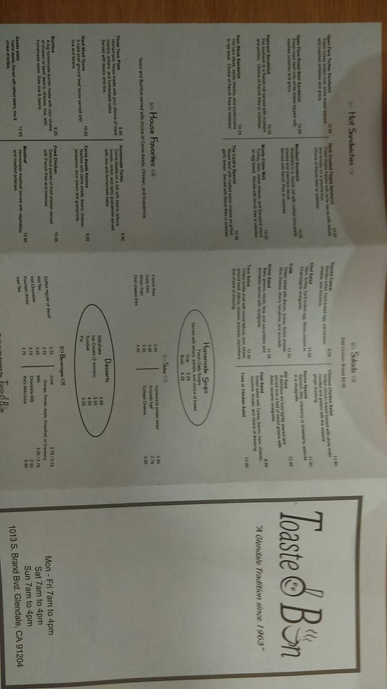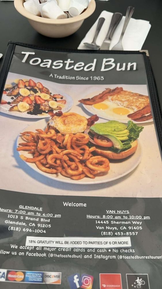 Toasted Bun, a cozy diner in Glendale, CA, offers a diverse breakfast and brunch menu with a retro-style ambiance. The extensive menu includes breakfast specialties like Eggs Benedict, Chilaquiles, omelets like Ortega Omelet and Veggie Omelet, and skillets such as S.E.D Scramble Skillet and Spanish Skillet. Customers praise the friendly service and clean facilities, with standout dishes like the French fries and corn pancakes. Despite not offering gluten-free options, patrons enjoy the flavorful dishes and reasonable pricing. The restaurant's decor, featuring strawberry-chocolate panels and minty green booths, adds to the overall experience. With quick service and attentive staff, Toasted Bun is a must-visit for those seeking a classic diner experience in the Glendale area.